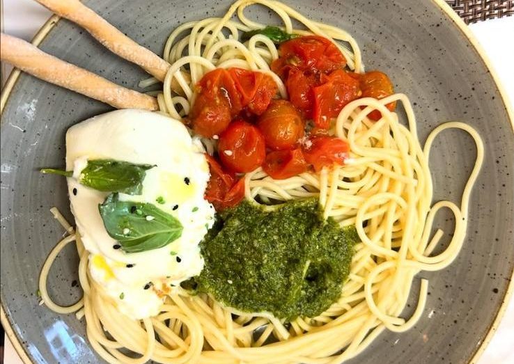Pasta con burrata y pesto